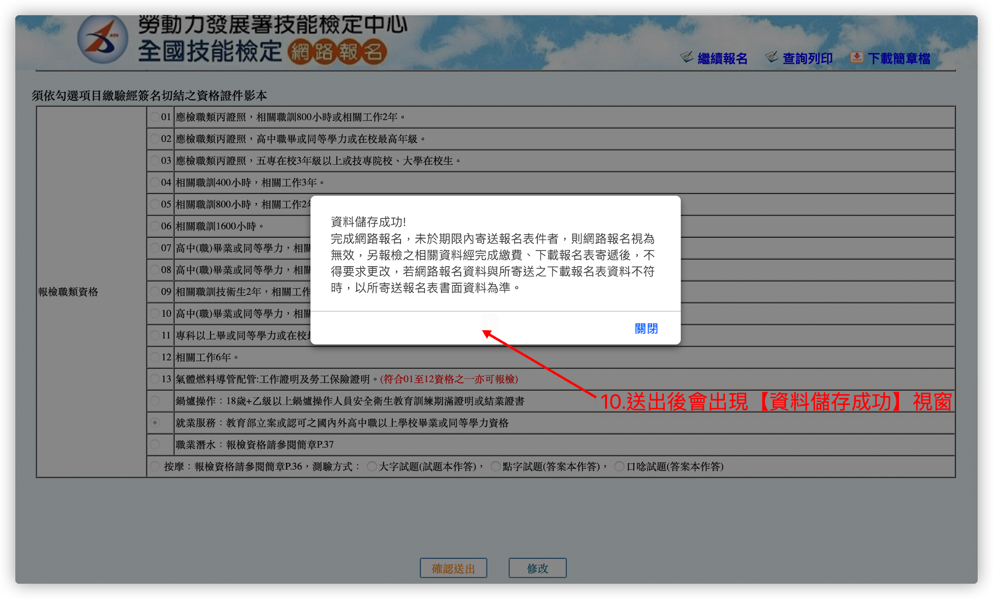 第10步:再次確認所有填寫的資料皆正確後,按「確認送出」,此時會出現「資料儲存成功」的提示訊息。
